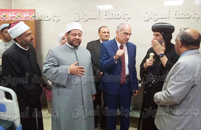 إستقبلت اليوم مستشفيات جامعة أسوان تحت رعاية الأستاذ الدكتور/ أيمن محمود عثمان- رئيس الجامعة- والدكتور/ لؤى سعد الدين نصرت- نائب رئيس الجامعة لشئون التعليم والطلاب- والدكتور/ محمد ذكى الدهشورى- عميد كلية الطب ورئيس مجلس إدارة مستشفيات الجامعة- والدكتور/ أشرف معبد- المدير التنفيذى لمستشفيات الجامعة- وفد مبادرة رحلات الخير وقيادات المجتمع المدنى بأسوان وضم الوفد المستشار سهيل المحجوبى بالقنصلية السودانية نيابةً عن السفير السودانى، والأنبا بيشوى أسقف كنائس أسوان والدكتور/ حسن حسين- رئيس منطقة الأزهر الشريف- والدكتور/ يوسف أحمد مصطفى نيابةً عن الشيخ حنفى دياب- وكيل وزارة الأوقاف بأسوان والشيخ/ محمود مصطفى- مدير إدارة أوقاف أسوان- والجالية السودانية بأسوان، وجمعية الهلال الأحمر، وجمعية أسوان اليوم للإعلام والتنمية، وجمعية مكسيم، وجمعية الجدات، وجمعية مستثمرى الطاقة فى بنبان، وسيدات المجتمع الأسوانى.
