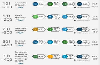 * جامعة الإسكندرية على المركز 101–200 في الهدف الثالث (الصحة الجيدة والرفاهية) والرابع (التعليم الجيد)، والخامس (المساواة بين الجنسين).