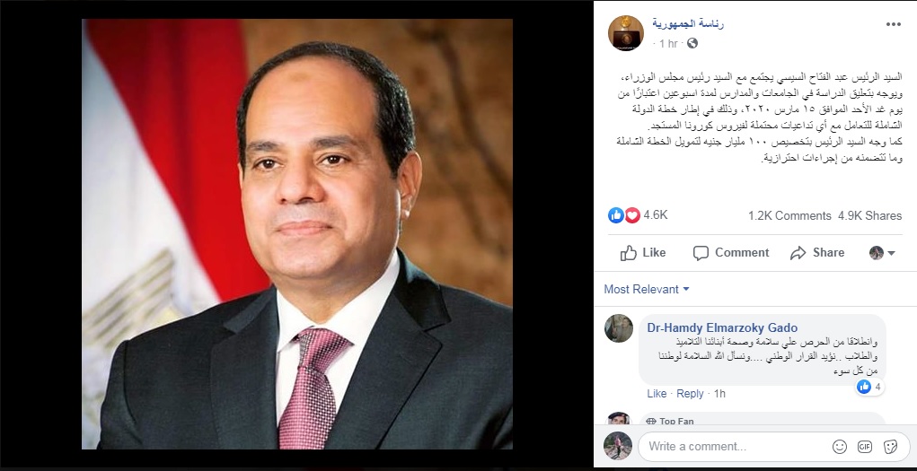 أكد الأستاذ الدكتور/ أحمد غــلاب محمد – رئيس جامعة أسوان في إِطار تنفيذ خطة الجامعة للمواجهة فيروس “كورونا” وخطة الوزارة في التعليم عن بعد خلال فترة تعليق الدراسة أن الجامعة أتخذت كافة الأجراءات الإحترازية في جميع الكليات وبالتنبية علي عمداء ووكلاء الكليات بالتواجد بمقر الكليات وبالتنسيق مع عمداء الكليات ووكلاء الكليات لشؤن التعليم والطلاب و رؤساء الأقسام ومدرسي المواد برفع المحاضرات علي صفحات الكليات والمنصه الإلكترونية وذلك تطبيقاُ لخطة الوزارة في التعليم الإلكتروني.