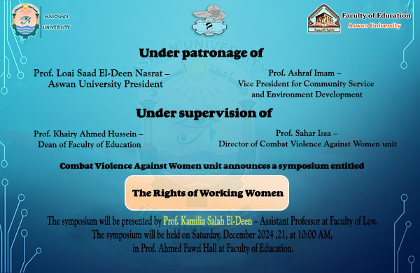 Under patronage of Prof. Loai Saad El-Deen Nasrat –President of Aswan University, and Prof. Ashraf Imam – Vice President of University for Community Service and Environment Development, and under supervision of Prof. Khairy Ahmed Hussein – Dean of Faculty of Education, and Prof. Sahar Issa – Director of Combat Violence Against Women unit announces a symposium entitled “The Rights of Working Women.” The symposium will be presented by Prof. Kamilia Salah El-Din – Assistant Professor at Faculty of Law.
