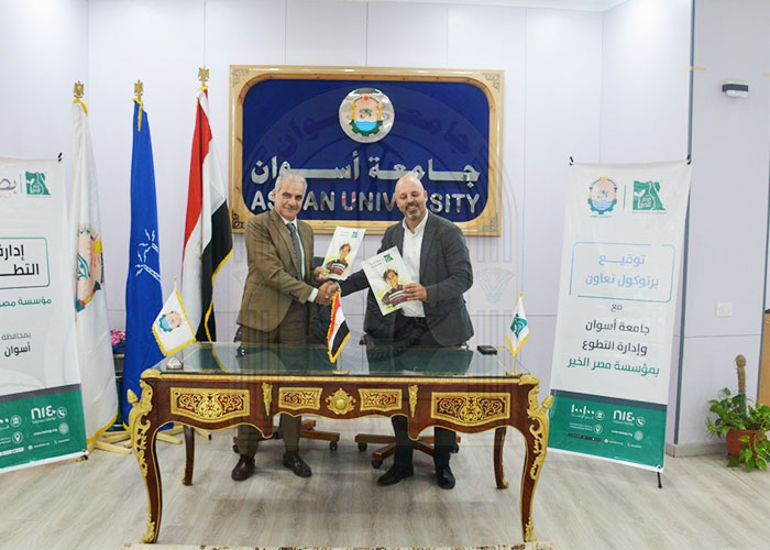 As part of Aswan University’s commitment to supporting its students and preparing them for community engagement, Prof. Loai Saad El-Deen Nasrat – Acting President of Aswan University – signed a joint cooperation protocol with Misr El Kheir Foundation (Volunteering Department), aimed at training and qualifying young cadres in professional volunteering concepts and promoting community work within the university.