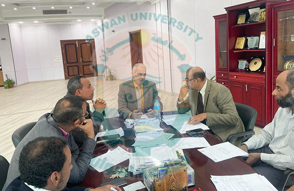 Prof. Loai Saad El-Deen Nasrat, Acting President of Aswan University, chaired a meeting of the Board of Directors of the Information and Communication Network Center, in the presence of Prof. Ashraf Emam – Vice President for Community Service and Environment Development, Dr. Mohamed Eid – Director of the Information and Communication Network Center, and board members Dr. Adel Fathy, Dr. Ali Mohamed Hussein, Dr. Mostafa Mohamed Abbas, and Eng. Haitham Mahmoud Eid.