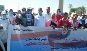 Prof. Ahmed Ghallab Mohamed_Aswan University President, participated with the students in the sports day, which includes a marathon running from the unfinished obelisk on the airport road to the university campus in Sahari, in which 150 male and 100 female students participated, then the participation of Academic staff, the university president and the dean of Faculty of Physical Education. At the end of the marathon, prizes were distributed for the winners, and the first place cup. The students also participated in the kayak competition at the Rowing Club, in attendance of students from Faculty of Physical Education.
