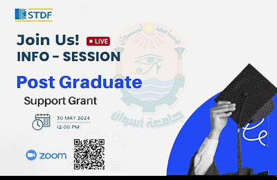 تنظم هيئة تمويل العلوم والتكنولوجيا والابتكار (STDF) جلسة تعريفية “أونلاين” عن برنامج تمويل طلاب الدراسات العليا (ماجستير – دكتوراه)، للباحثين من الجامعات والمراكز البحثية، تتضمن كافة الشروط وقواعد التقدم للبرنامج والإجابة على كافة استفساراتكم، وذلك الخميس ٣٠ مايو ٢٠٢٤، الساعة الثانية عشر ظهرًا.